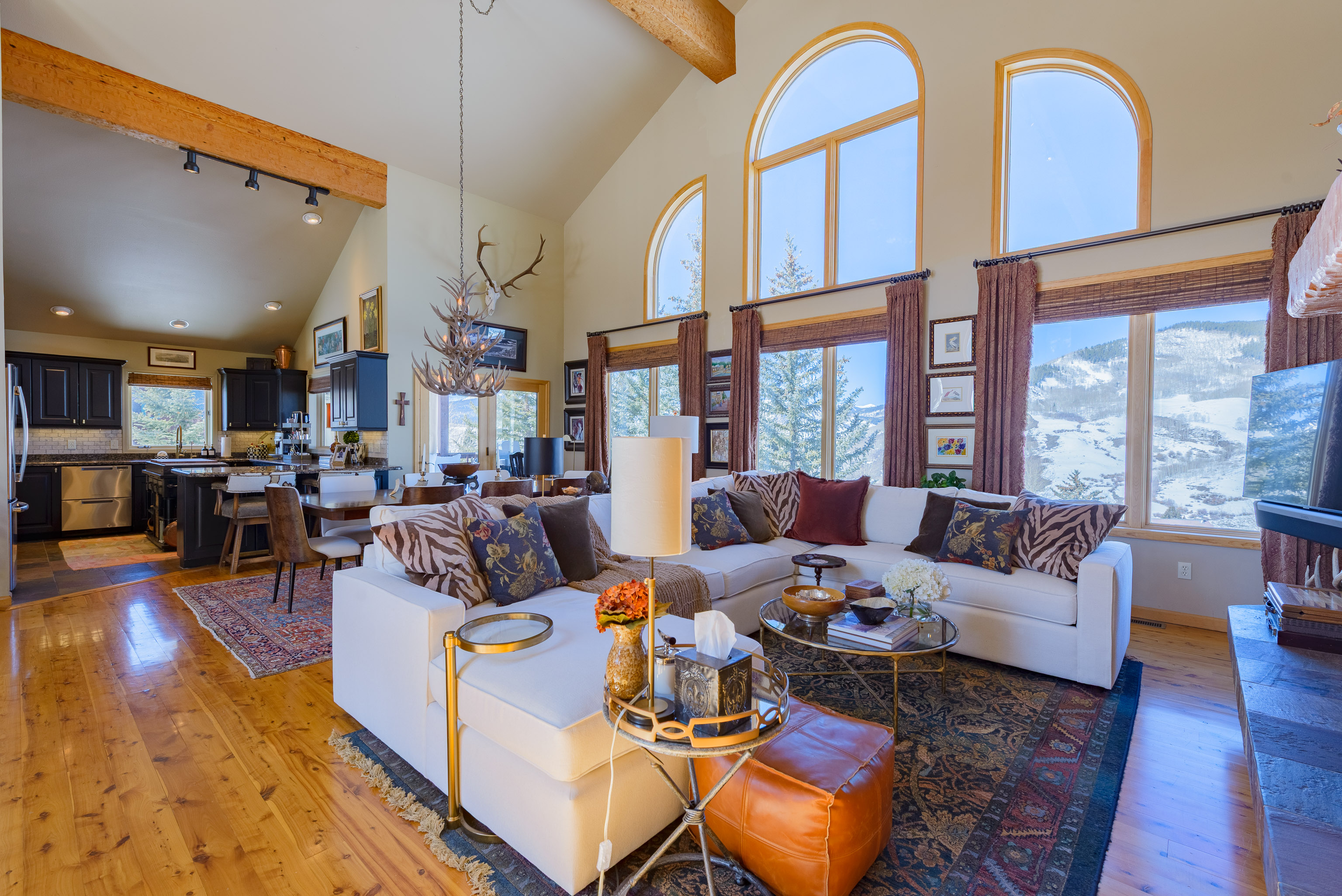 The main living area features a warm, open floor plan with Australian Cypress hardwood floors, large view windows, vaulted ceilings, gas log fireplace, log and timber accents, and seamless flow between the gourmet kitchen, dining, and great room — ideal for gathering and entertaining.