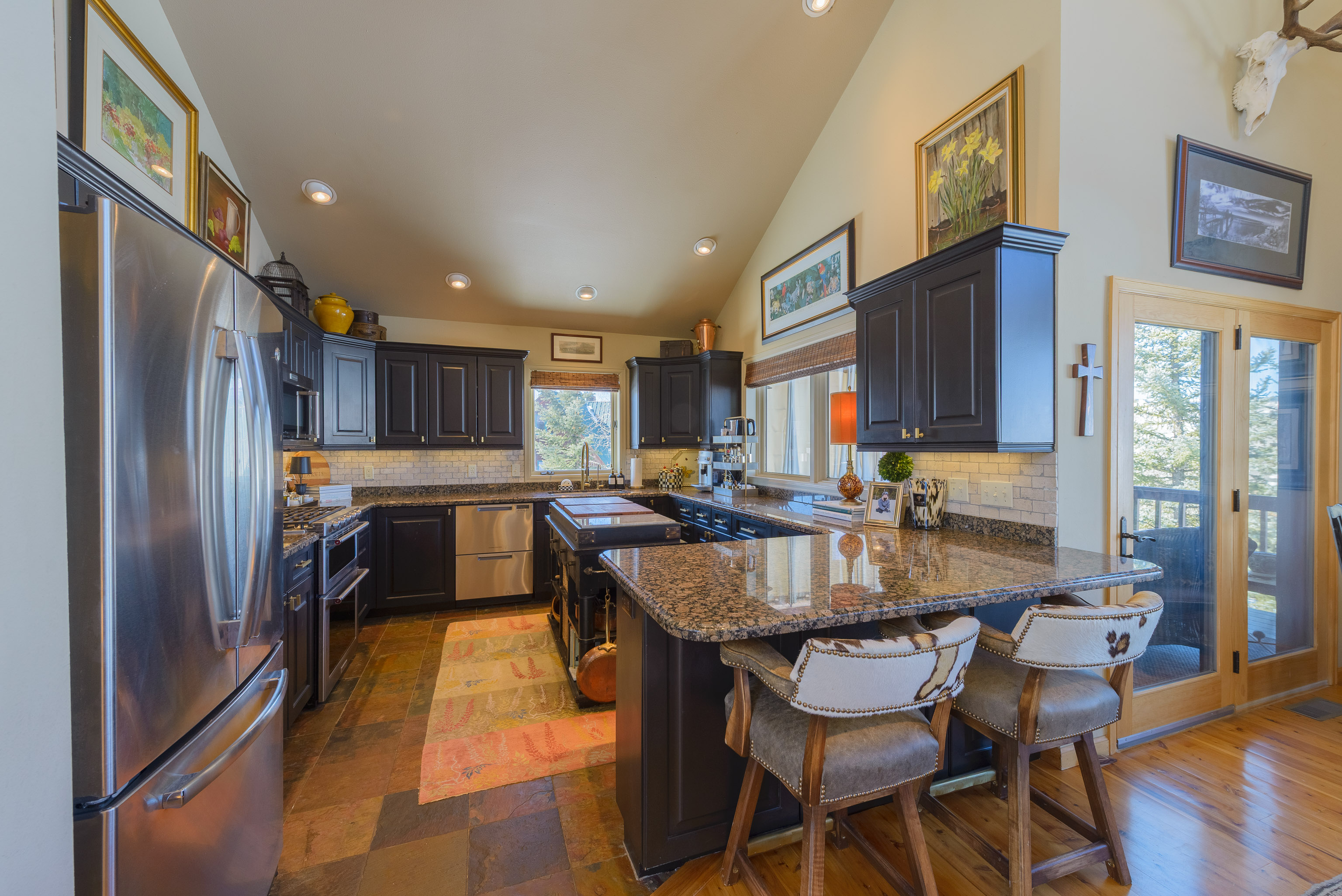 The back deck has become a favorite gathering space, featuring outdoor speakers, infrared heaters, and an exterior hot tub. Whether enjoying après-ski evenings, summer dinners, or simply relaxing after a day in the mountains, the space offers a comfortable setting to take in the surrounding views and enhances the home’s connection to its natural mountain setting.